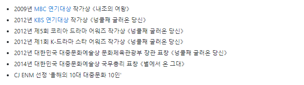 2011년 ‘시크릿 가든’으로 백상예술대상, 서울드라마어워즈, 코리아드라마어워즈 작가상 그랜드슬램