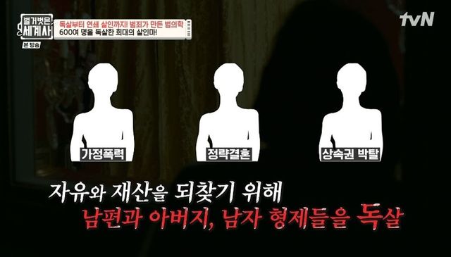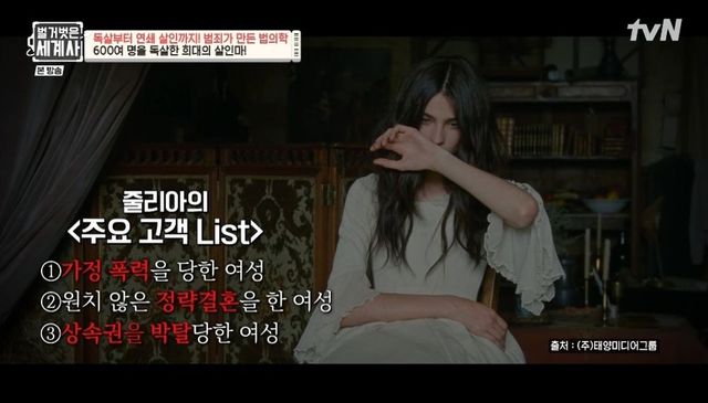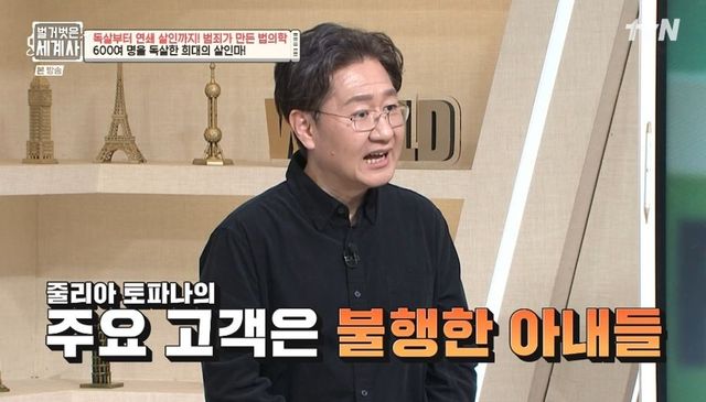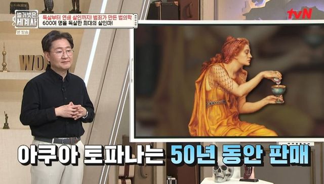 유 교수는 “17세기 독살범 줄리아 토파나는 비소로 만든 아쿠아 토파나를 제조, 600명을 독살했다”고 밝혔다. 마치 성수처럼 위장해 판매한 독약. 그는 가정 폭력을 당하거나 원치 않은 정략결혼을 한 여성, 상속권을 박탈당한 여성 등 불행한 아내들을 타깃으로 정했고, 아쿠아 토파나는 무려 50년 동안 판매되었다고. 권일용은 “‘600명의 여성을 살린 독살범’이라고도 불린다”고 덧붙였다.