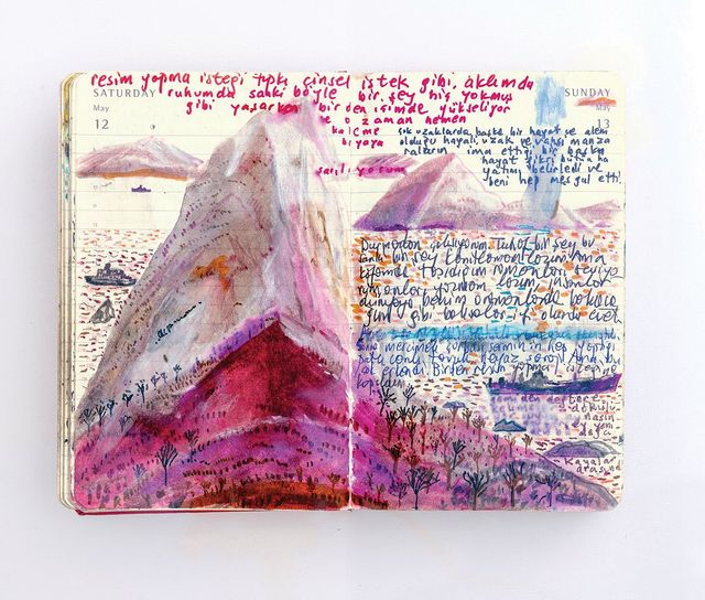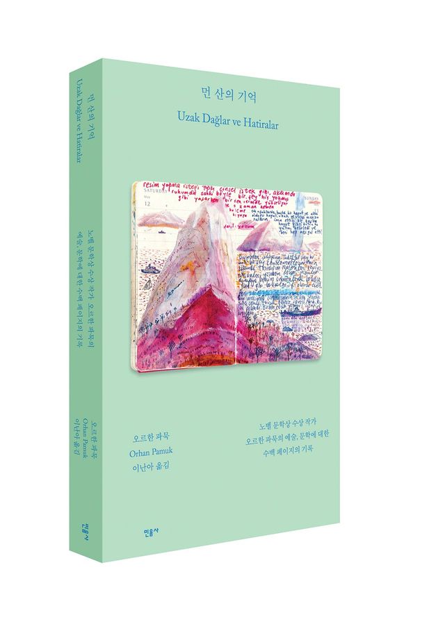 〈먼 산의 기억〉은 그가 14년간 쓴 그림일기를 4백 페이지로 압축한 책이다. 페이지마다 작가가 직접 쓴 몰스킨 다이어리의 단면을 함께 실었다. 가로 8.5cm, 세로 14cm의 손바닥 만한 노트에는 깨알 같은 글씨가 빼곡하다. “마치 세상을 이 공책 안에 숨기고 있는 것 같다”는 작가의 말처럼 거기엔 미국 화가 레이먼드 페티본과 사이 톰블리를 동경하는 마음부터 여행 전의 우울함에 대한 단상 같은 사소한 이야깃거리가 넘친다.