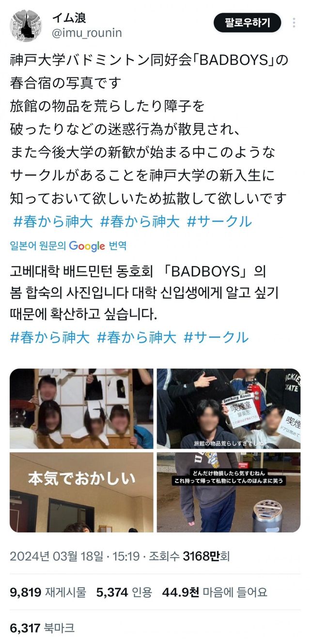 고베대 배드민턴 동호회 ‘BADBOYS’ 봄 합숙사진이 트위터에 폭로되었는데…