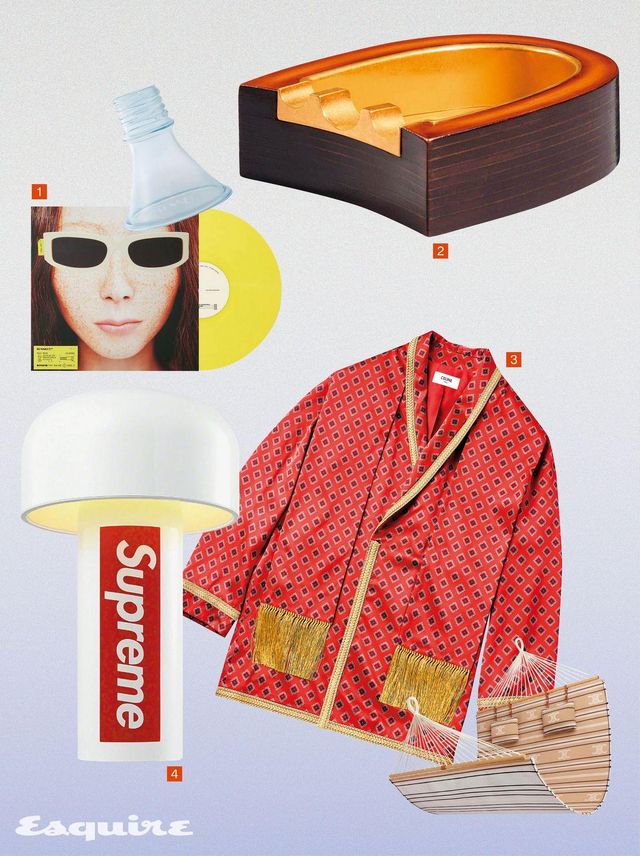 3. 1920년대 귀족 문화에서 영감을 얻은 실크 & 새틴 소재의 드레싱 가운 가격 미정 셀린느 옴므. 탈부착 가능한 2개의 쿠션과 스트랩으로 구성한 우드, 자카르, 카프스킨 레더의 해먹 가격 미정 셀린느.