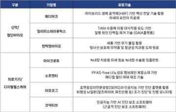 이번 프로젝트 1단계에는 신약/첨단바이오 분야 3개사[㈜메디아크, ㈜일리미스테라퓨틱스, ㈜현텍엔바이오]와 의료기기/디지털헬스케어 분야 4개사[㈜마이크로트, ㈜소프엔티, ㈜이모코그, ㈜코넥티브]가 선정됐다.