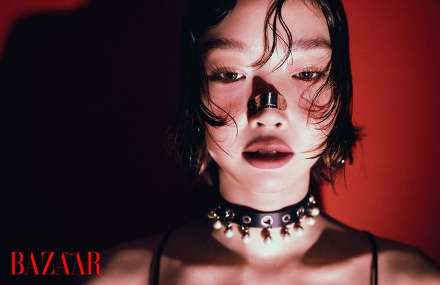 슬립은 Iro. 노즈 커프는 8만원대 Tee Ring Jay. 귀고리는 Balenciaga. 초커는 Dior.