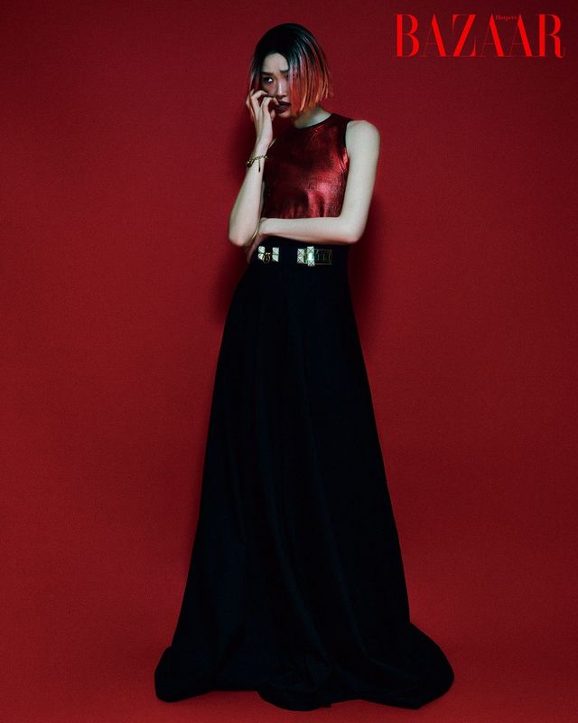 메탈릭 탱크톱은 26만원 Pushbutton. 스커트는 Balenciaga. 브레이슬릿은 Off-White™. 벨트는 Hermès.