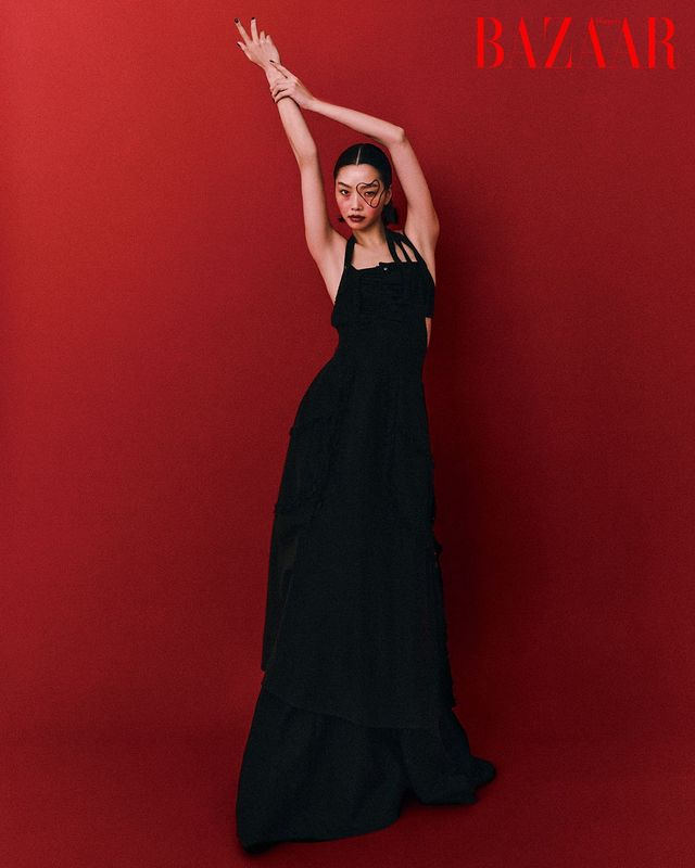 배클리스 드레스는 Maison Margiela. 브라 톱은 Bottega Veneta. 레이어드한 스커트는 Balenciaga.