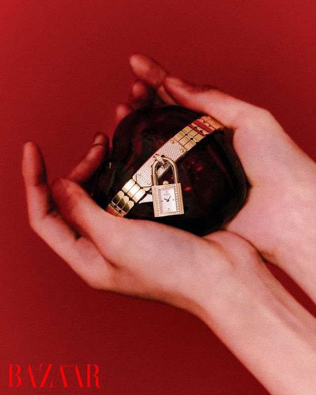자물쇠 모티프 케이스를 장착한 로즈 골드 ‘켈리’ 워치는 Hermès Watch.