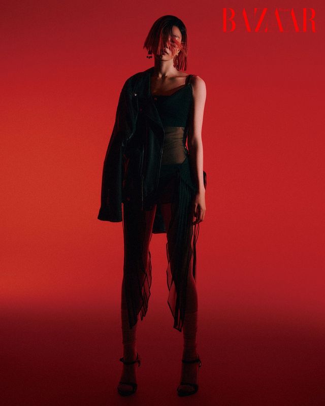 라이더 재킷은 89만원대 Allsaints. 시스루 드레스는 Bonbom. 브라 톱, 브리프는 Bottega Veneta. 귀고리는 Dolce & Gabbana. 삭스 샌들은 Balenciaga.