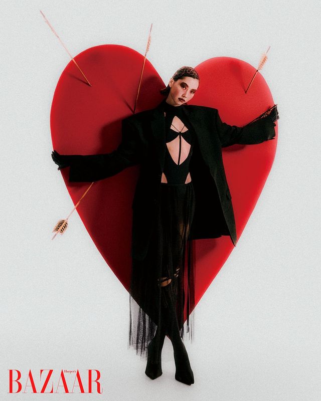 재킷, 펜타 슈즈는 Balenciaga. 보디수트는 Moncler×Willow Smith. 스커트는 Fabiana Filippi.