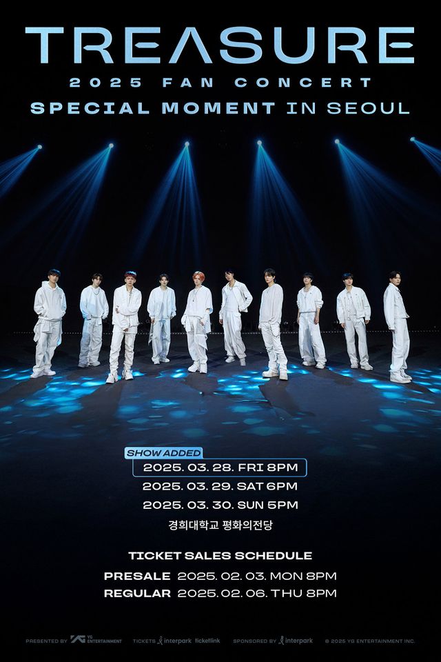 이번 티켓 오픈은 앞서 공식 팬클럽 TREASURE MAKER MEMBERSHIP 가입자를 대상으로 진행됐던 선예매와는 달리 누구나 구매가 가능하다. 오후 8시부터 인터파크 티켓과 티켓링크에서 시작된다. 이를 통해 추가 개최를 확정한 오는 3월 28일 공연을 예매할 수 있다.