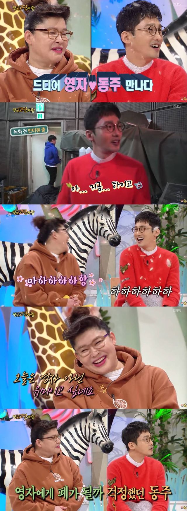 황동주는 "데뷔 전인데 (이영자씨를) 보면 너무 기분이 좋아졌다. 너무 좋아하는걸. 첫 소속사 들어갔을 때 이상아 선배에게 말했더니 영자 언니가 인터뷰 오는데 신촌으로 빨리 오라고 하더라. 혼자 머리 집에서 하고 옷도 제일 좋은 걸로 하고 갔다"고 고백했다.