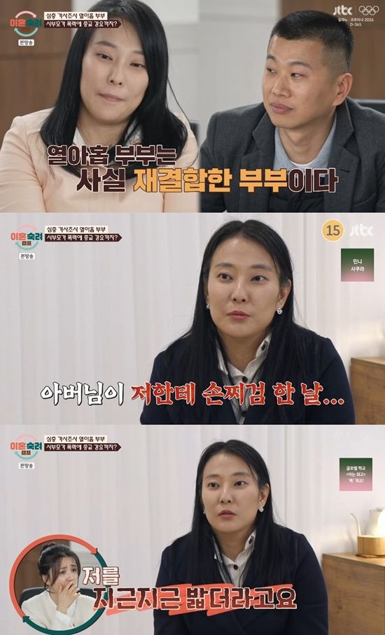 남편은 "일주일 내내 술 마시고 많게는 새벽 3시까지 잠 못자게 하고 어머니랑 몸싸움할 때도 있었다"고 말했다. 이에 아내는 "날짜도 기억난다. 10월 5일. 아버님이 내게 손찌검 한 날"이라며 "갑자기 아버님이 욱해서 나를 지근지근 밟더라. 나중에 보니까 멍이 들어있었다"고 떠올렸다.