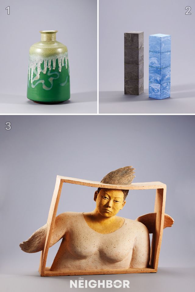 1 김재석, ‘화병’, 연도 미상, 백자토, 색유, 금채, 23×22.5×22.5cm, C&S 컬렉션. 2 김덕호, 이인화, ‘2023 SeMA 하나 미디어아트상 트로피’, 2023, 백자토, 안료, 연마, 20×4.8×4.8(×2)cm, 작가 소장. 3 한애규, ‘날개를 단 여인’, 1989, 석기토, 안료, 아크릴릭 물감, 48×68×15cm, 개인 소장.