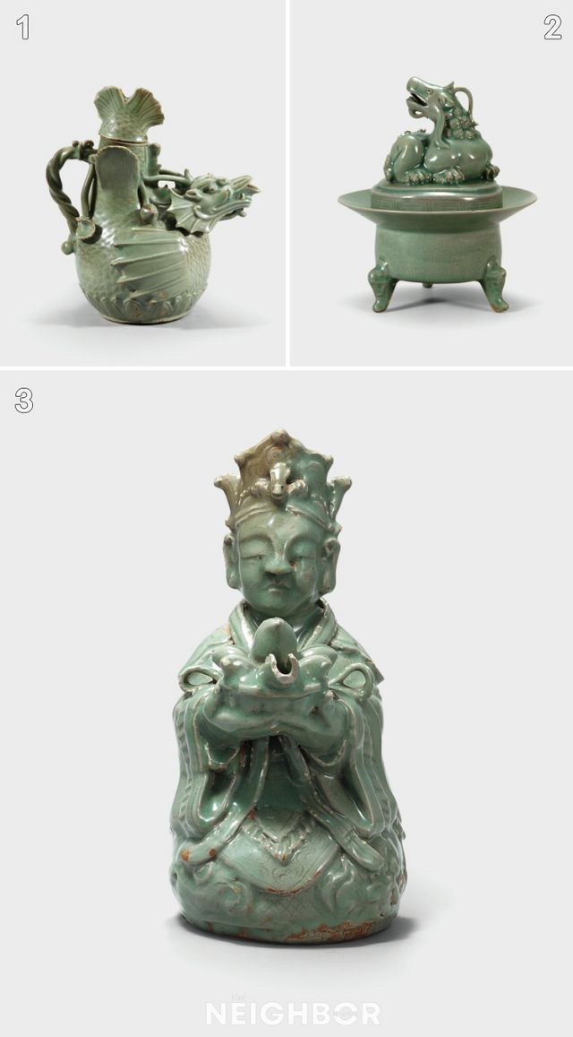 1 ‘청자 어룡모양 주자(靑磁魚龍形注子)’, 고려 12세기, 높이 24.4cm, 국립중앙박물관(개성2), 국보. 2 ‘청자 기린모양 향로(靑磁麒麟形香爐)’, 고려 12세기, 높이 20.9cm, 아모레퍼시픽미술관. 3 ‘청자 사람모양 주자(靑磁人物形注子)’, 고려 13세기, 국립중앙박물관(신수3325), 국보.