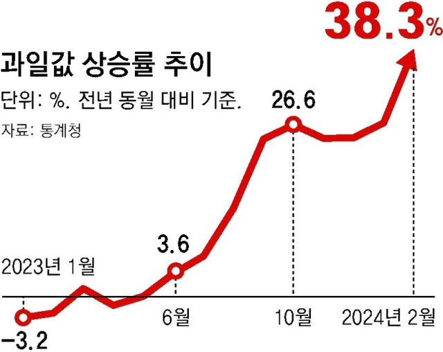 지난달 과일값이 1년 전보다 38% 넘게 뛰면서 32년 만에 최대 폭으로 올랐다.