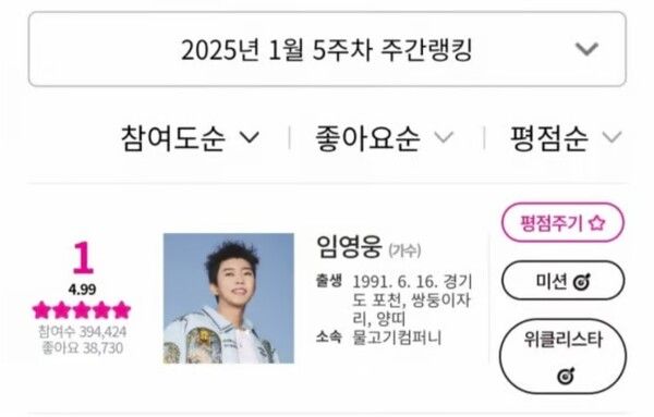 임영웅은 1월 5주차 아이돌차트 평점랭킹에서 39만 4424표를 획득하며 1위를 차지했다. 이로써 임영웅은 201주 연속 1위라는 전무후무한 기록을 달성했다.
