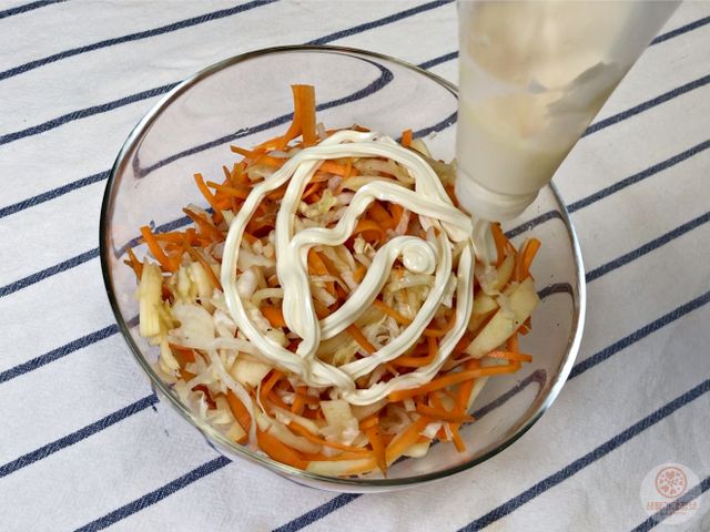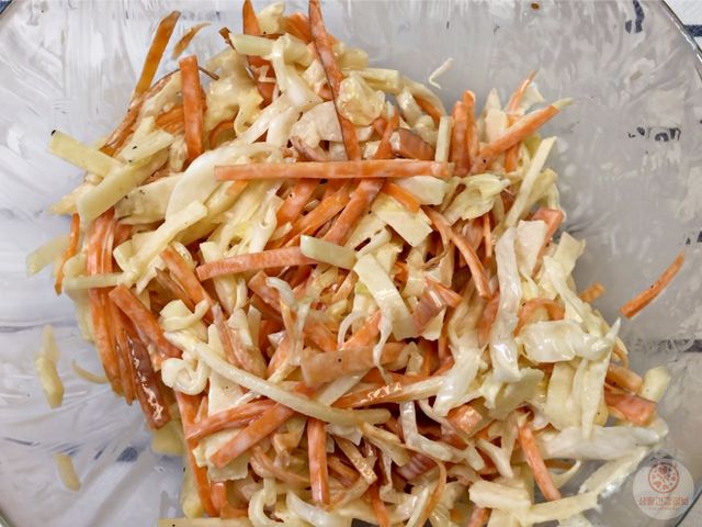 그다음 마요네즈 뿌려서 버무리면