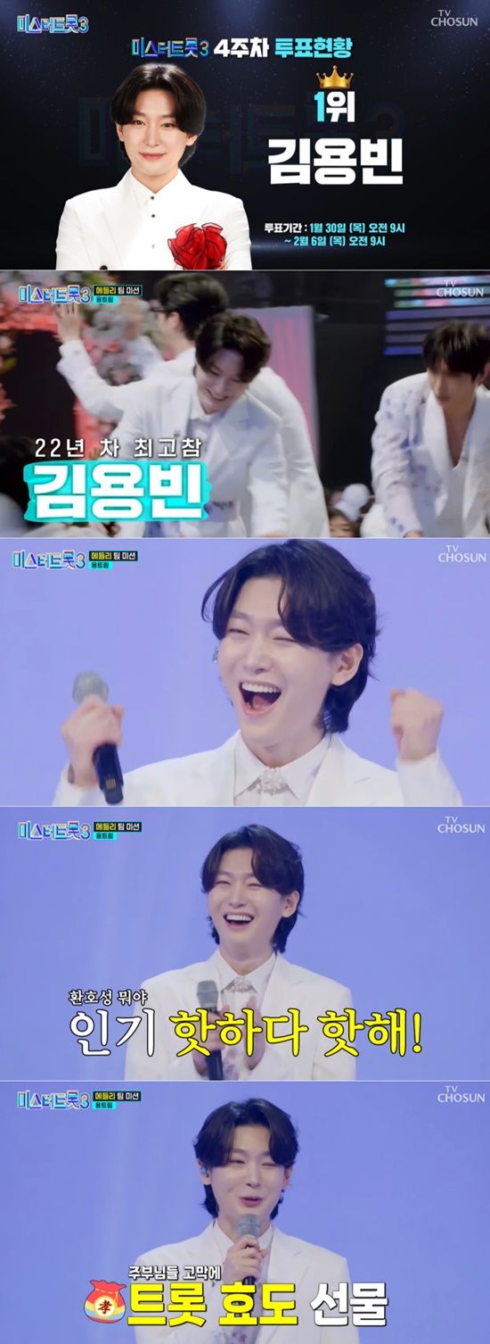 (엑스포츠뉴스 김예나 기자) 가수 김용빈이 '미스터트롯3' 투표에서 4주 연속 1위를 차지, 강력한 우승 후보 입지를 단단하게 굳혔다.