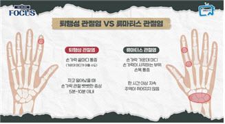 관절의 노화로 발생하는 퇴행성 관절염은 주로 손가락 끝마디에 통증이 발생한다. 반면 자가면역반응으로 인해 발생한 류마티스 관절염은 손가락 가운데 마디와 시작 부위, 손목에서 통증이 발생한다. 또한, 기상 후 류마티스 관절염은 주먹을 쥐지 못할 정도의 경직이 1시간 이상 지속되는 반면, 퇴행성관절염은 손가락 관절의 뻣뻣함이 5-10분 이내로 지속된다.