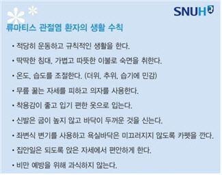 “류마티스 관절염은 만성 난치성 질환이지만, 약물치료와 비약물치료를 적절히 병행하면 관절 변형을 예방하고 통증을 완화하여 삶의 질을 높일 수 있습니다. 약물치료의 경우 처방받은 약의 종류와 기능을 이해하고 잘 복용하는 것이 중요합니다. 특별한 식이요법은 없지만 관절 부담을 줄이기 위해 체중조절에 신경을 써 주시는 것이 좋습니다.”