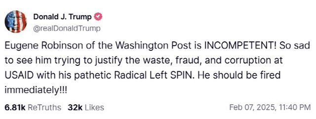 트럼프 대통령은 이날 자신의 소셜미디어(SNS) 트루스소셜을 통해 미 일간 워싱턴포스트(WP)의 칼럼니스트인 유진 로빈슨을 거론하며 “무능하다. 당장 해고돼야만 한다”고 주장했다.