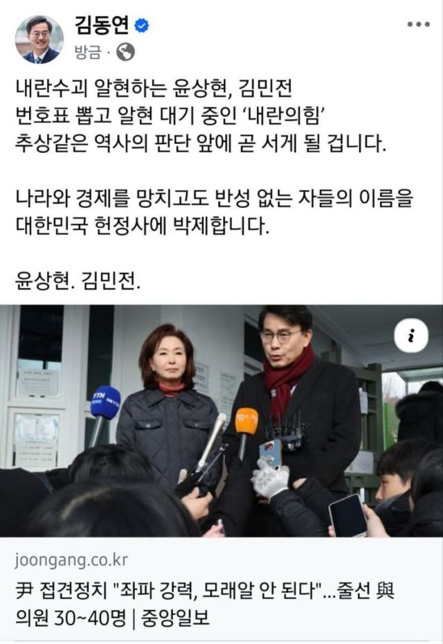 김동연 경기도지사가 내란 우두머리 혐의를 받고 수감중인 윤석열 대통령을 면회한 국민의힘 윤상현, 김민전 의원을 향해 "추상같은 역사의 판단 앞에 곧 서게 될 것"이라고 비판했다.