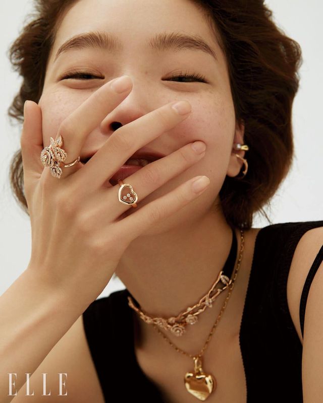 Dior Joaillerie. 약지에 낀 하트 모티프의 로즈골드 해피 다이아몬드 아이코닉 링은 5백14만원,