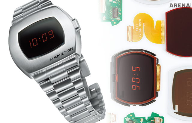 세계 최초의 디지털 손목시계는 해밀턴에서 개발한 ‘펄사 P-1(일명 펄사 타임 컴퓨터)’이다. 쿼츠 크리스털 기반의 시간 측정 칩과 간결한 빨간색 LED 디지털 디스플레이를 결합한 제품. 하지만 당시 기술력으로는 디지털 디스플레이를 구현하는 회로의 전력 소모가 많아서 시계를 상시 켜둘 수 없었고, 사용자는 시계 화면 아래에 있는 버튼을 눌러 잠시 동안만 시간을 확인할 수 있었다. 고가인 만큼 고급스러운 이미지를 위해 금도금을 했지만, 2100달러(현재 가치 약 1770만원)에 이르는 높은 가격은 내부 회로에 들어간 비용 때문이었다고 한다. 지금 보면 디자인도 단순하고 실용성도 부족해 보이지만, 당시에는 이 시계가 최첨단 하이테크의 상징이었다. 후속 모델인 P-2는 1973년 개봉한 제임스 본드 영화 <007 죽느냐 사느냐>에 등장해 화제를 모으기도 했다. 시간이 흘러 지난 2020년에는 펄사 타임 컴퓨터의 탄생 50주년을 기념해 이를 복각한 해밀턴 PSR 라인업이 출시됐다.