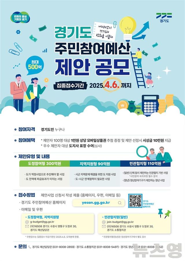 (뉴스영 이현정 기자) 경기도가 2026년 주민참여예산 반영을 위한 제안 사업을 오는 4월 6일까지 집중 접수한다. 도는 주민참여예산 제안을 연중 상시 접수하지만, 내년 예산에 반영하기 위해서는 4월 6일까지 제안을 접수해야 한다.