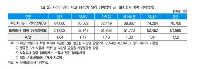 이에 따라 보험사와 정비업체는 협의회 기준의 일정 범위에서 개별 계약을 체결하지만, 수입차 딜러 정비업체는 작업시간과 시간당 공임에서 협의회 결정을 준수하지 않아서 같은 차종에서도 정비요금이 월등히 비싼 것으로 확인된다고 연구원은 지적했다.