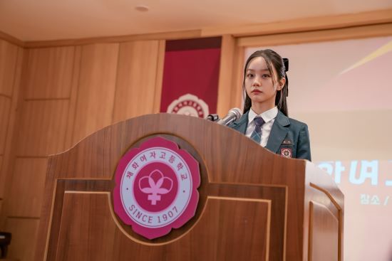먼저 첫 번째 스틸컷에는 전교생 대표로 입학설명회를 위해 강단에 선 유제이와, 길을 잘못 들어 교무실이 아닌 강당으로 들어온 전학생 우슬기가 담겨있다. 채화여고의 정점에 선 유제이와 혼자 다른 교복을 입은 이방인 우슬기의 대비가 눈길을 끌며 이들 사이에 어떤 이야기가 펼쳐질지 기대하게 만든다.
