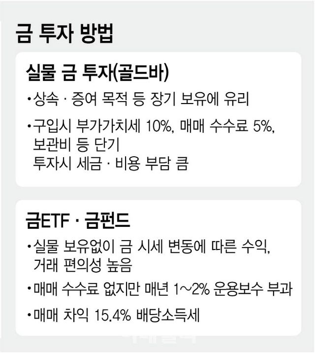 5대 시중은행 PB들은 금 투자에 대해 골드바 등 실물, 금ETF·금펀드, KRX 금 현물 계좌 등을 세금과 투자 기간 등을 고려해 선택하라고 조언했다. 골드바 등 실물은 매매 시 부가가치세와 매매 수수료 등이 20%에 달해 상속·증여 등을 염두에 둔 장기 투자를 권했다. 윤지환 팀장은 “골드바 등 실물 자산은 안정성이 높고 보유세가 없어 상속·증여 등에 활용하기 좋다”며 “매입 시 부가세와 매매수수료, 보관에 따른 비용을 염두해야 한다”고 설명했다.