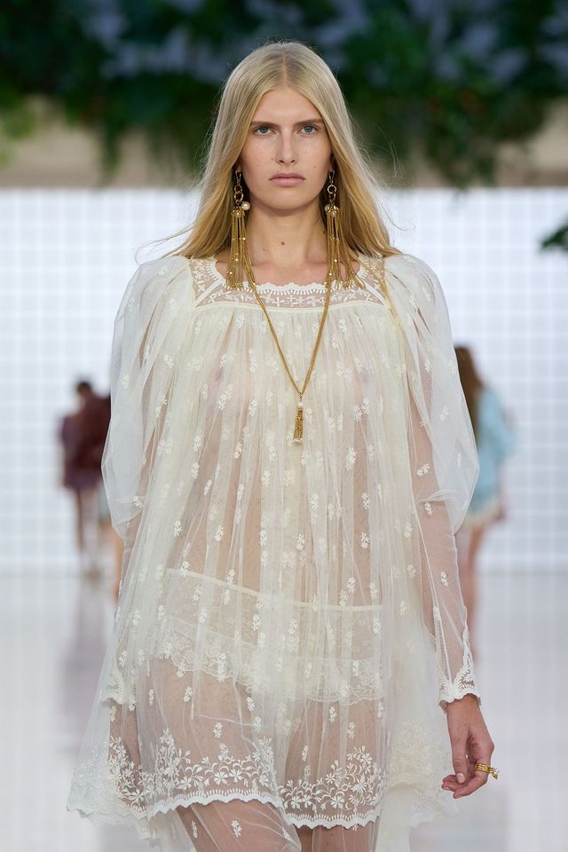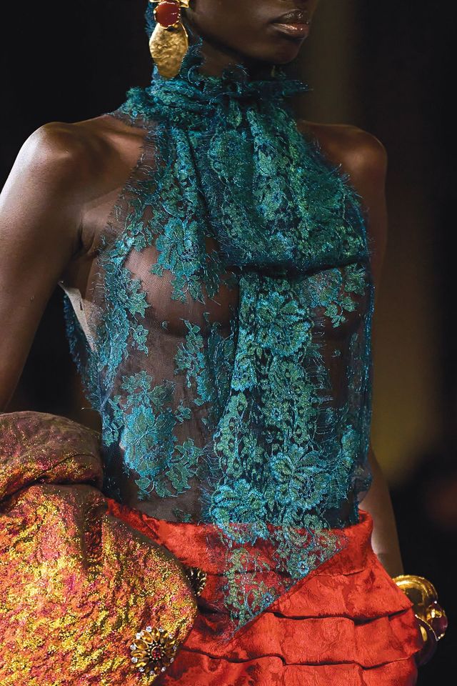 레이스 소재의 섬세하고 우아한 관능미에 눈을 뜬 디자이너들. 구찌, 끌로에, 발렌티노, 생 로랑 등의 쇼에서는 시어한 소재와 레이스가 어우러진 다채로운 피스로 몸의 라인을 드러내며 레이스 스타일링의 정수를 보여주었다. 특히 발렌시아가는 트롱프뢰유(Trompe-l’œil, 눈속임) 기법의 레이스 브라, 보디수트, 가터벨트와 스타킹 등 온몸을 뒤덮은 란제리 룩으로 속옷과 겉옷의 경계를 허물며 쿨하고 섹시한 스타일로 눈길을 끌었다.