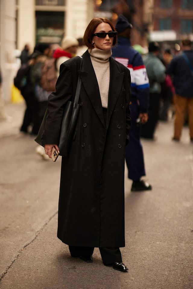 2025 F/W 뉴욕 패션위크 스트리트 스타일에서도 목격할 수 있었습니다. 모던하고 시크한 애티튜드가 돋보이는 블랙 롱코트는 은은한 베이지 터틀넥 톱으로 부드러운 터치를 더하기에도 좋고, 누드 톤의 보디수트로 보다 날렵하고 도회적인 느낌을 불어넣기에도 제격이죠.