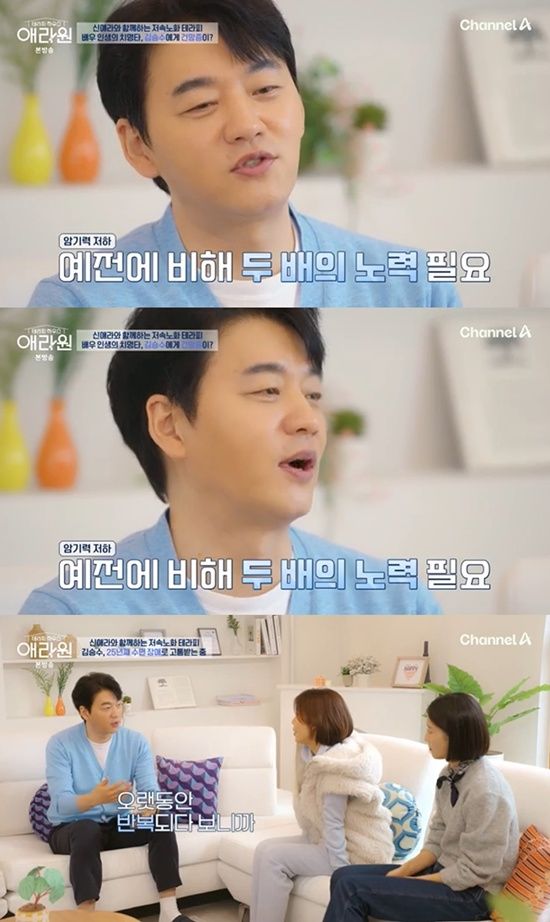 현재 혼자 살고 있다는 김승수는 스스로를 "독거노인"이라고 말했다. 가장 고민되는 건강문제로 그는 "50대 중반이 되니까 건망증이 심해졌다. 대사 외울 때도 전보다 1.5배에서 2배 노력해야 한다"고 했고, 같은 배우인 신애라는 공감했다.