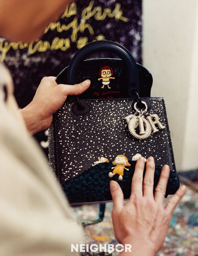 우국원은 유화, 종이 드로잉과 설치작품을 주로 선보여온 작가로 동화를 장난스럽게 재해석한 그의 유쾌한 작품들은 구성적 요소와 팝아트를 결합해 허구와 현실의 모호한 공존을 보여준다. 작가는 이런 관점을 바탕으로 백을 다섯 가지 모델로 재해석하며 자신의 작품 활동에 깃든 서사를 이어 나간다. 두 가지 미디엄 모델에서는 아티스트의 아내, 딸과 반려견을 상징하는 캐릭터가 매혹적으로 공간을 채우고 있다. 첫 번째 모델에는 주인공들이 컬러풀한 실로 아름답게 그린 언덕 위에서 밤하늘의 별을 바라보며 어린 딸에 대한 사랑을 표현한 ‘My Universe’라는 메시지가 적혀 있다. 두 번째 모델은 만개한 벚꽃나무 아래를 산책하는 주인공들을 표현했다. 진실과 환상의 간극을 보여주는 세 번째 모델은 정교하게 수놓은 북극곰과 ‘Killing me Softly’라는 메시지를 통해 강렬하고도 아이러니한 디자인을 강조했다. 미니 버전은 오렌지, 블루, 레드, 화이트 컬러의 펄 덩굴로 장식해 호화로운 퍼를 연상시키고, 또 다른 마이크로 버전은 크리스찬 디올 시그너처와 대비되는 수많은 블랙 비즈와 스팽글이 돋보인다.