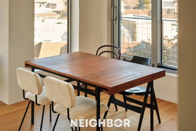 빈티지 제품으로만 구성한 거실의 테이블과 의자. 테이블은 피에르 귀아리슈, 의자는 앙드레 시마르의 부클 패브릭 의자, 토넷 14번 체어, 에곤 아이어만의 SE18을 섞어서 사용한다.