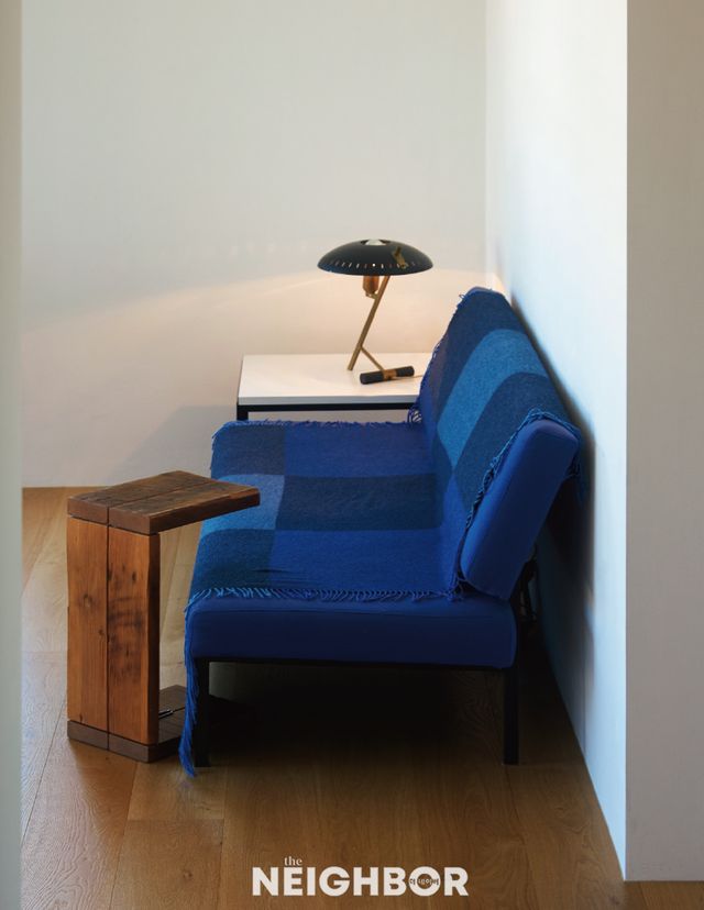 거실의 파란 소파는 이 집의 유일한 컬러 포인트다.