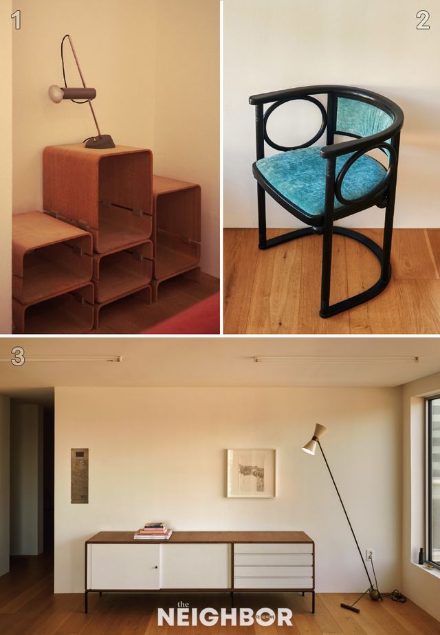 1 침실에 놓인 지노 사르파티의 566 램프. 유닛 선반은 자크 뒤몽의 디자인. 2 요제프 호프만이 디자인한 암체어로 비엔나 제체시온의 감성이 묻어난다. 3 긴 사이드보드는 강한 존재감으로 집 안의 구심점이 된다. 플로어 램프는 1980년대 이탈리아 스틸노보에서 제작된 것.