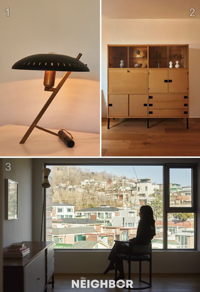1 루이스 칼프의 Z 램프. 우주선에서 받은 영감이 반영된 디자인이 흥미롭다. 2 여러 형태의 수납이 가능한 르네장 카이예트의 캐비닛.3 거실 창밖으로 인왕산과 북악산이 보인다. 가장 최근에 구입한 요제프 호프만의 암체어에 앉아 있는 박선영 작가.