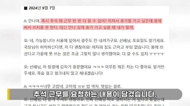 공개된 메신저 내용에 따르면 A 씨는 오 씨에게 “안나야, 혹시 추석 때 근무 한 번 더 할 수 있어? 지쳐서 휴가 가고 싶은데, 봄에 써서 쓰지를 못한다. 대신 안나 길게 휴가 가고 싶을 때 내가 할게”라고 제안했다.