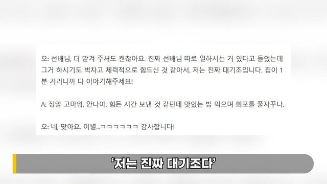 그러자 A 씨는 “고맙다. 밥 먹자. 맛있는 걸로”라고 말했고, 오 씨는 “선배님, 더 맡겨주셔도 된다. 선배님 따로 일하는 거 있다고 들었는데 그거 하시기도 벅차고 체력적으로도 힘드실 것 같다. 저는 정말 대기조다. 집이 1분 거리니까 다 이야기해달라”라고 응원했다.
