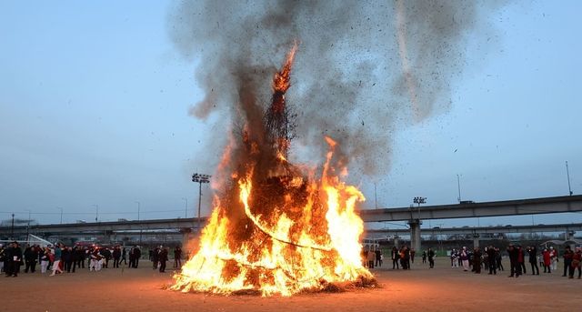 정월대보름에 액막이로 '대형달집'을 태우는 시민들의 모습 / 뉴스1