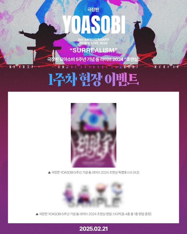 공개된 이벤트 경품인 ‘극장판 요아소비 5주년 기념 돔 라이브 2024 초현실 특별 포스터(A3)’는 요아소비만의 매력이 묻어나는 몽환적인 비주얼로 시선을 끈다. 그리고 이와 함께 증정될 예정인 스티커는 총 4종 중 1종을 랜덤으로 증정하며 이번 영화의 공연 컨셉인 ‘초현실’과 걸맞은 개성 가득한 비주얼로 소장 가치를 높인다. 특히 스티커는 일본 오리지널 특전 경품과 동일한 경품으로 알려져 더욱 특별함을 더한다.