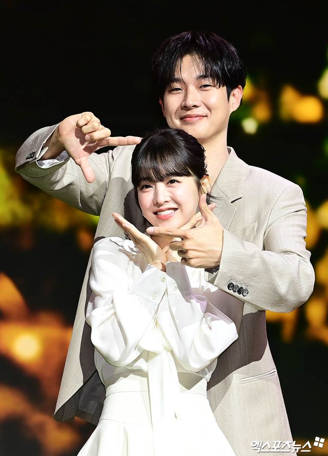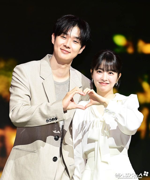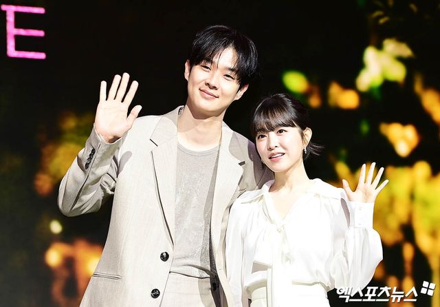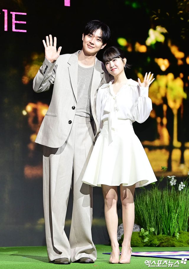 이날 제작발표회에 참석한 배우 최우식, 박보영이 포토타임을 갖고 있다.