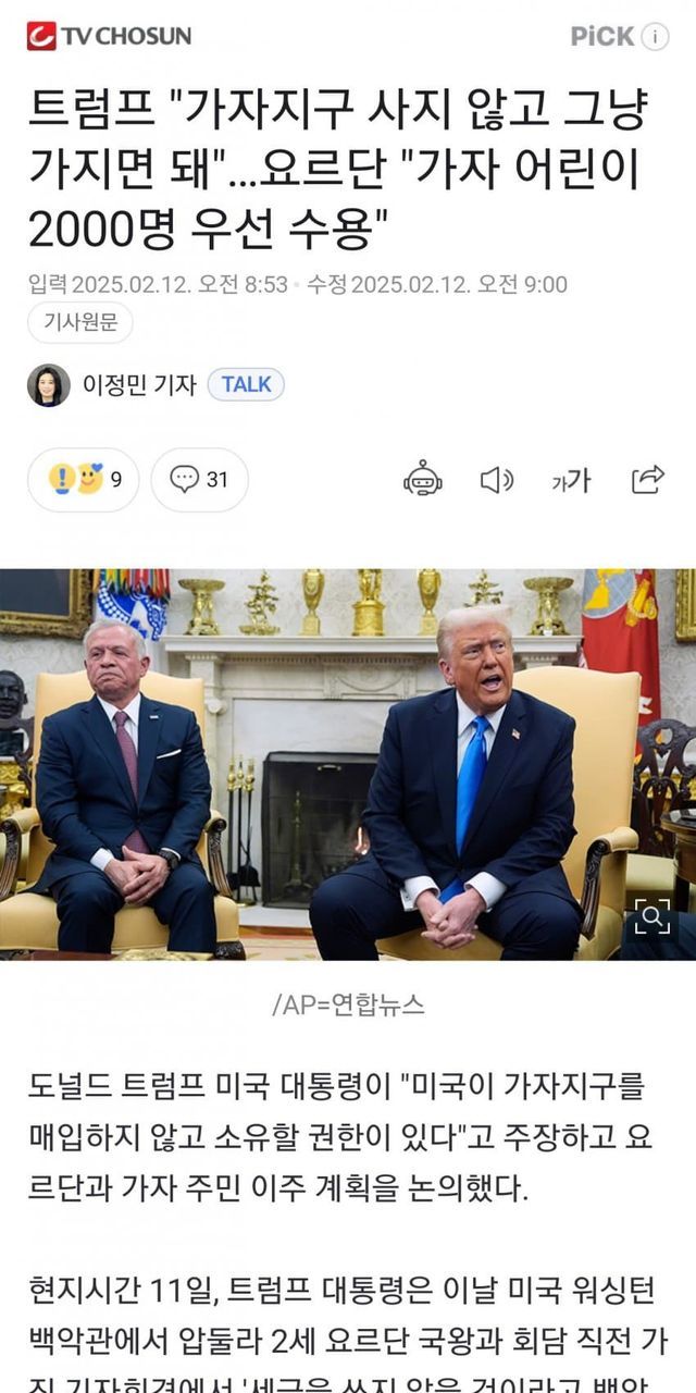 요르단은 당초 트럼프 대통령의 구상에 반대한다고 밝혔으나, 이날은 가자지구 어린이 2000명을 우선 받아들이겠다며 전향적인 태도를 보였다.