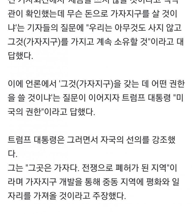 그게 무슨 의미냐 취재진이 재차 묻자 "살 이유가 없다. 그 곳은 가자다. 전쟁으로 폐허가 된 지역이다"며 "우리가 가져가서 지키면서 소중히 간직하고, 끝내는 중동 지역 주민들을 위해 많은 일자리가 만들어지도록 할 것이다"고 말했다.