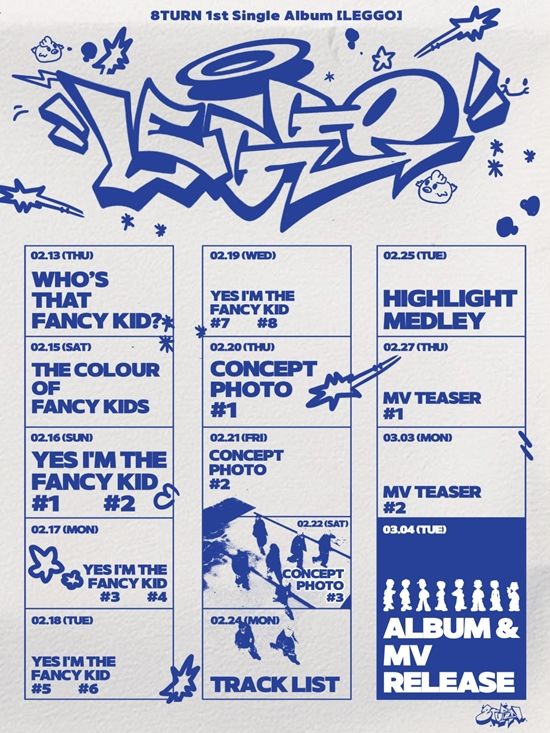 공개된 스케줄러에 따르면 오는 3월 4일 발매되는 8TURN의 새 싱글은 'LEGGO(레고)'이다. 8TURN은 13일 'WHO'S THAT FANCY KID', 16일부터 19일까지 'YES I'M THE FANCY KID'란 타이틀의 콘텐츠를 차례로 공개한다.