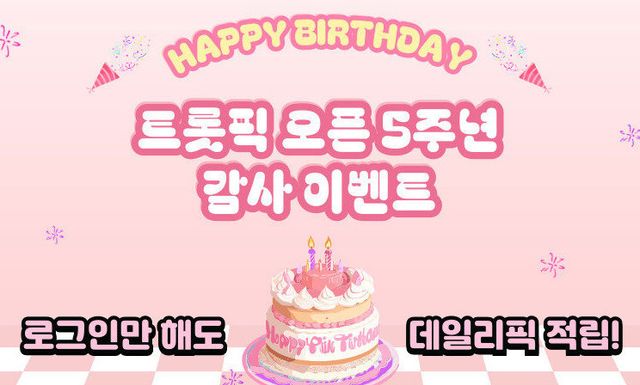 13일 트롯스타 투표 웹서비스 ‘트롯픽’(trotpick)은 오픈 5주년을 기념해 오는 17일 픽 지급 이벤트를 개최한다고 알렸다. 17일 당일(오후 2시까지) 트롯픽에 한 번이라도 로그인을 한 가입 회원에 한해 레벨 구간별로 픽을 지급하는 방식이다.
