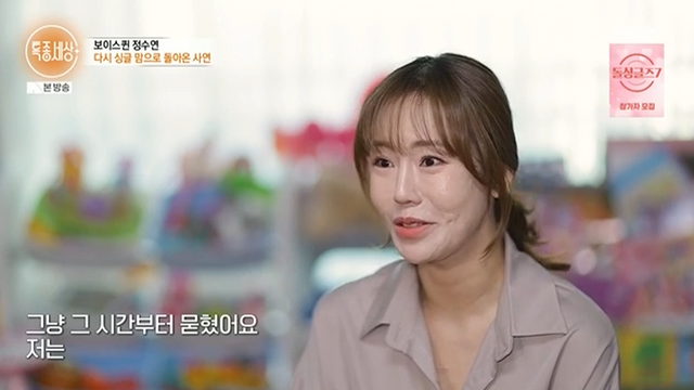정수연은 '보이스퀸'에서 아들 한 명을 둔 싱글맘임을 고백하며 화제를 모았다. 하지만 1년 만에 무대에서 사라지며 궁금증을 자아낸 바 있다.
