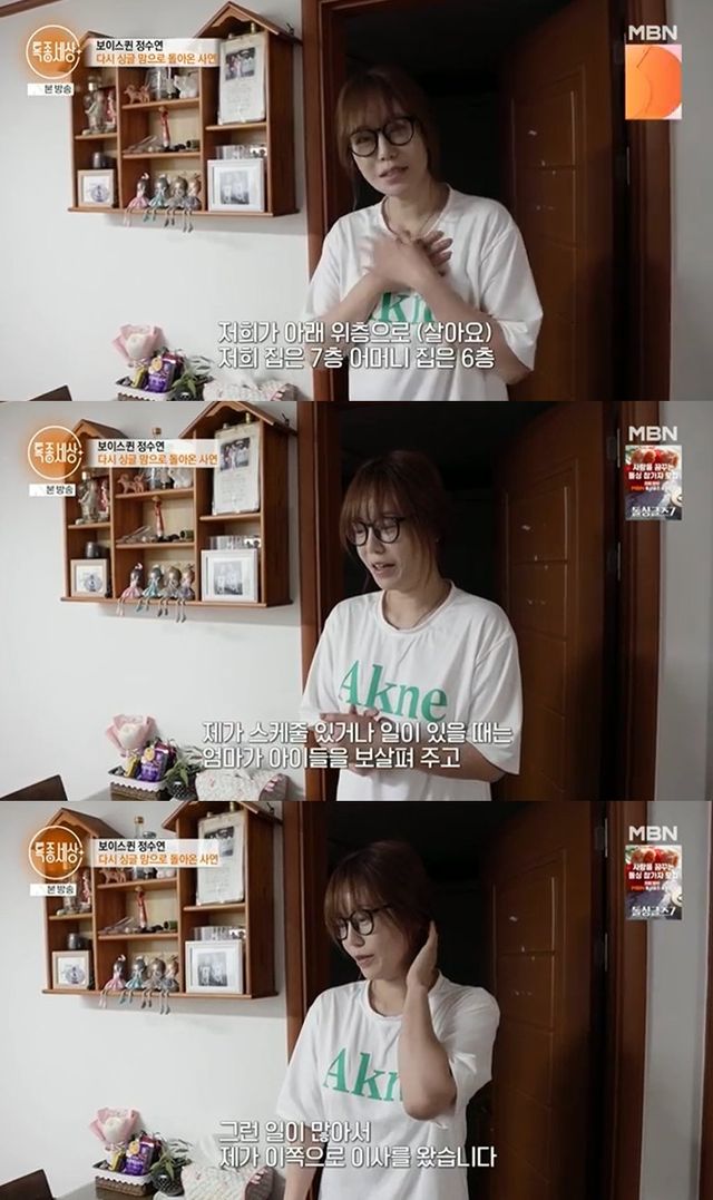 이날 방송에선 서울 한 아파트 단지에서 11살 된 아들의 하교와 5살 딸의 하원을 챙기는 정수연의 모습이 공개됐다. 그는 재혼 후 딸을 낳았다고 털어놓았다.